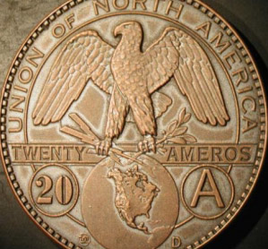 Estadounidense asegura en Internet que Estados Unidos, Canadá y México acuñan el “amero” que sustituirá sus respectivas monedas. Estados Unidos.- De acuerdo con un correo electrónico que circula por la red, Hal Turner, un estadounidense a quien le cancelaron su programa de radio en internet, por medio de otros recursos se ha valido para dar a conocer la maniobra que alista Estados Unidos para cambiar el dólar por una nueva moneda llamada el 'amero'. Turner se vale del internet para presentar su versión de lo que los altos niveles de gobierno de Estados Unidos, Canadá y México preparan para sustituir sus respectivas monedas, incluso muestra una imagen de la nueva moneda de color cobrizo. En un video con duración de ocho minutos y 33 segundos, Turner asegura que su website halturnershow.com fue sometido a alta presión por parte de los medios de comunicación y del gobierno federal por lo que ya no pudo continuar con dicho show. De acuerdo con TurneR, "a principios de esta semana publiqué en mi blog halturnershow.blogspot.com, la historia de que el gobierno de EU había enviado 800 mil millones de ameros al banco de Desarrollo de China”. "En preparación para el colapso del dólar estadounidense como moneda. Mucha gente visitó mi sitio y pensó que era un engaño, pero señores y señoras, no fue un engaño", comentó. Afirma que tiene uno de los ameros de ese envío, mientras muestra una moneda de color cobre con un águila y con la inscripción Unión de América del Norte de nominación 20 ameros. Según Turner, la moneda fue acuñada en Denver Mint, en Denver, Colorado, en 2007, aunque no se aprecia bien en la imagen. “Los gobiernos ahora entienden que el dólar estadounidense no va a valer nada. Va a desaparecer como moneda porque el gobierno federal de EU está gastando tanto dinero que debe pedir prestado el 80-90% de los ahorros del mundo entero con tal de financiar su déficit de gasto", señaló. Agregó que los gobiernos de todo el mundo saben que esto no puede continuar y que probablemente dentro de seis meses, quizá en febrero del 2009, el dólar estadounidense va a colapsar como moneda. La intención, dijo, es unir en un solo bloque a los tres países del TLC, Estados Unidos, Canadá y México. Turner, quien da a concer esta teoría, enfatiza que el dólar americano colapsará, debido a que la nación norteamericana debe mucho dinero, además de los intereses que genera, por lo que será inservible. Por último, da algunas sugerencias para la población estadounidense en relación a qué hacer en este caso y recomienda comprar, en la medida de las posibilidades, el capital en plata u oro.